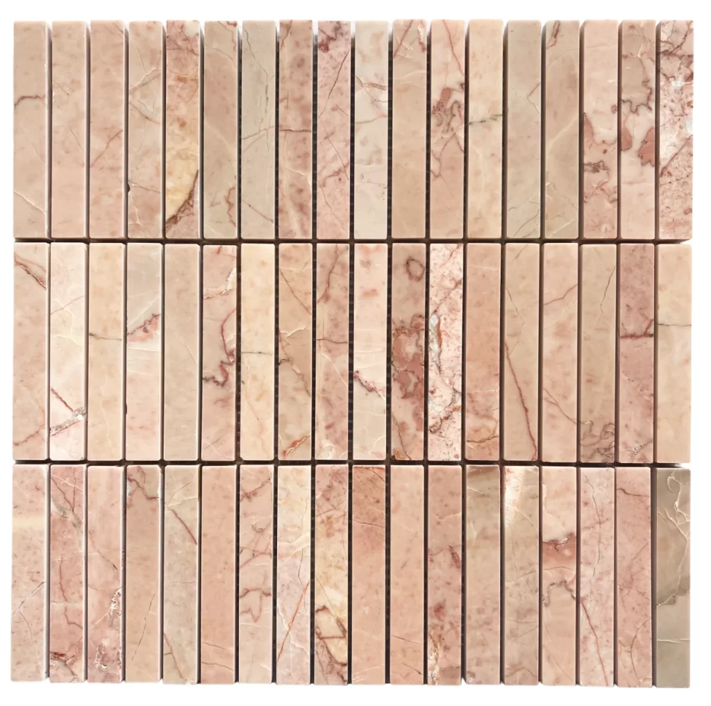 Rosso Stack is a delicate and elegant marble mosaic featuring a soft pink base with graceful white and gold variations. The gentle pink tones create a warm and inviting feel, while the white veining adds subtle contrast and depth. Hints of gold weave through the surface, bringing a touch of luxury and sophistication. With a honed finish that enhances its natural beauty, Rosso is perfect for feature walls, backsplashes, kitchens and bathrooms, adding a refined and timeless charm to any space.