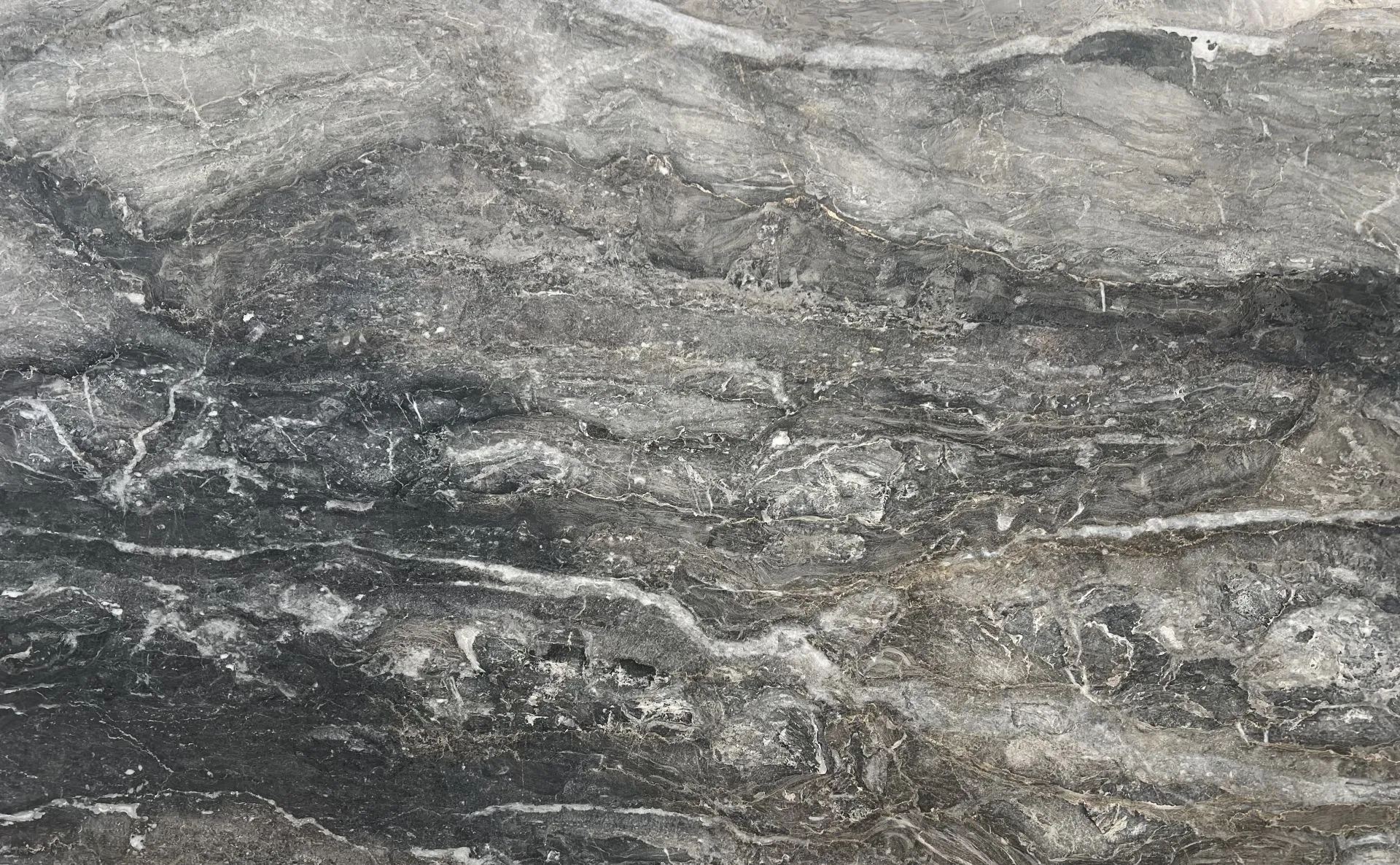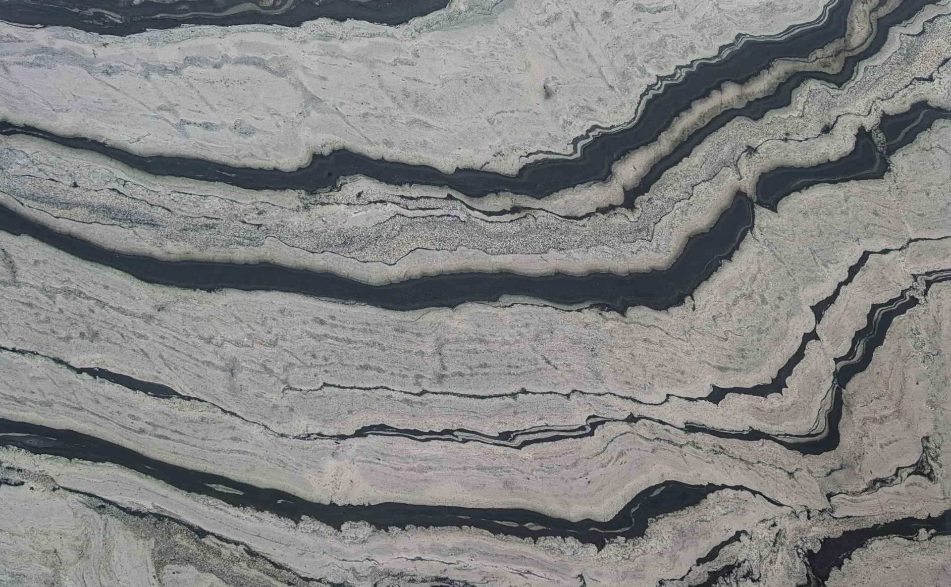Eclipse Quartzite is a striking natural stone defined by its cool, contemporary aesthetic. It features a soft light grey background, elegantly contrasted by flowing waves of charcoal