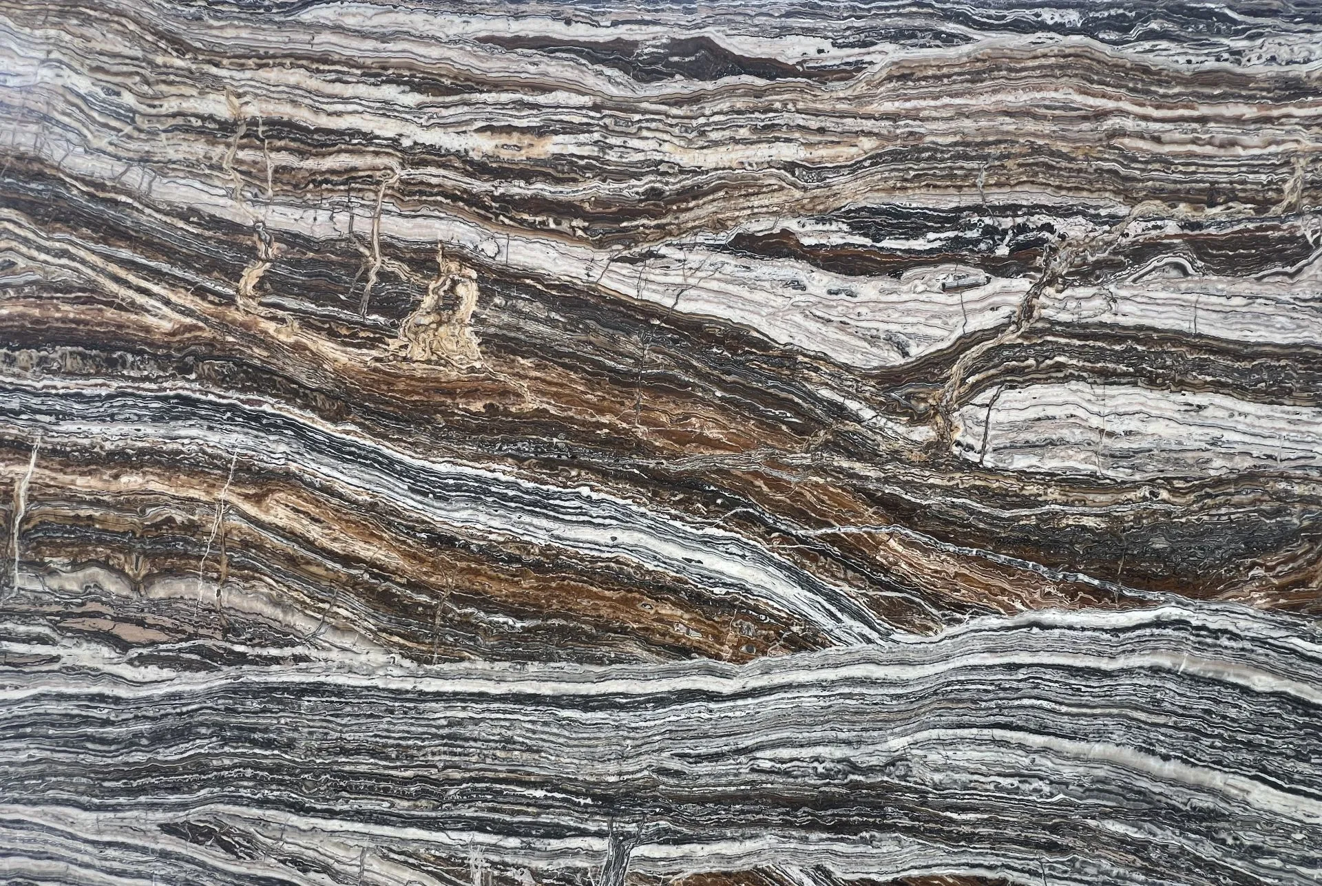 Jurassic Vein Cut Travertine is a bold and dramatic natural stone featuring rich layers of earthy tones. Its striking horizontal bands of deep brown, golden caramel, and soft beige create