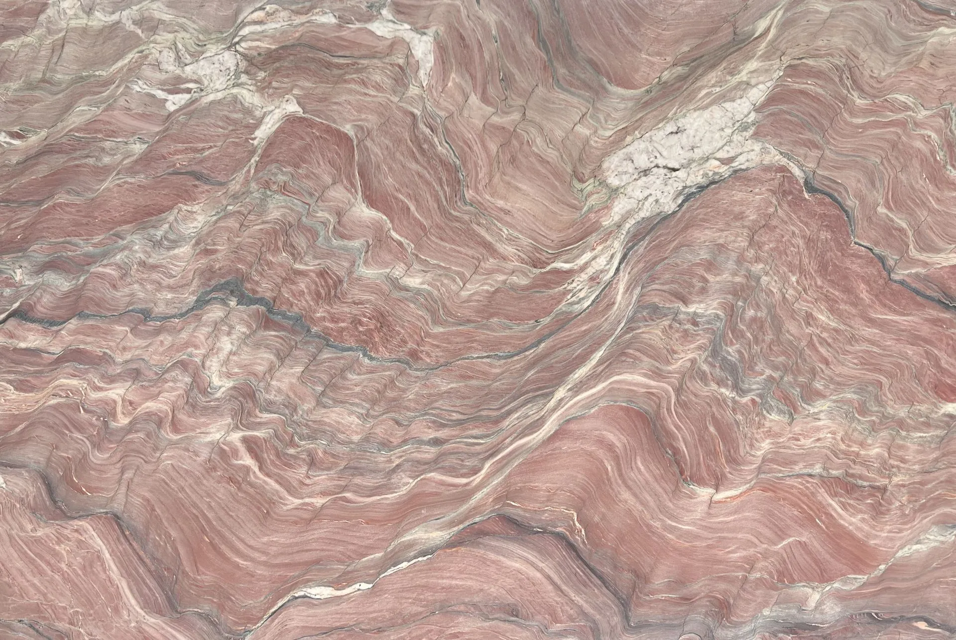 Breccia Damascata Marble features bold, natural character with a rich blend of warm tones. Its surface showcases a striking mix of rose, terracotta, and soft taupe, interwoven with dramatic veining.